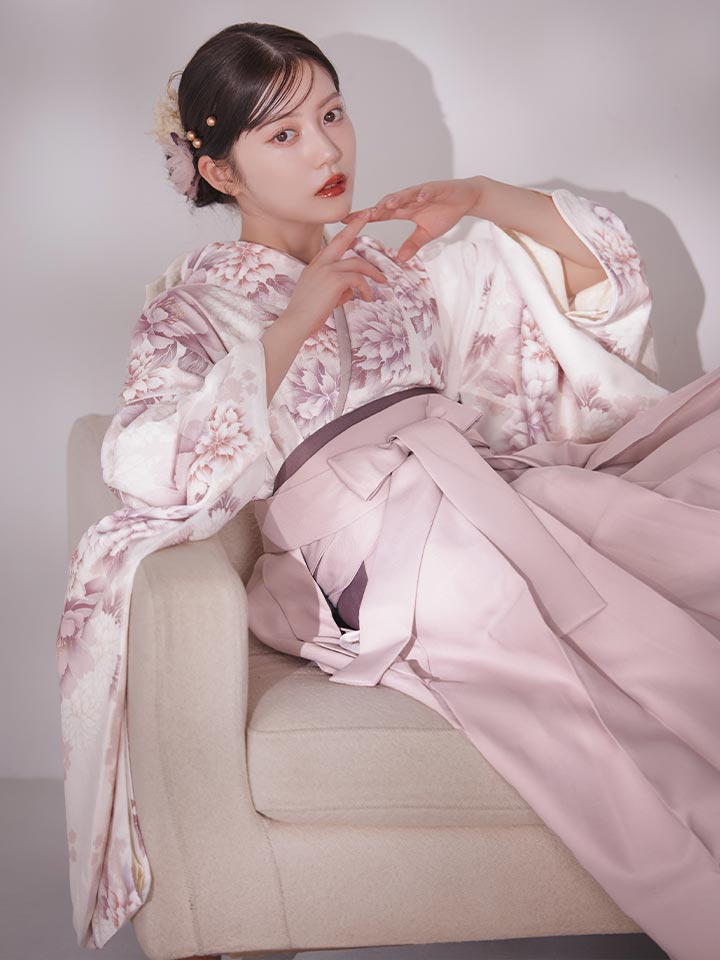 【予約商品 / 1月中旬発送予定】ピンク牡丹×菊 ペールピンク二尺袖着物【卒業袴3点セット 二尺袖着物/帯/袴】
