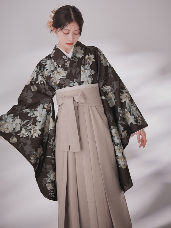 【予約商品/1月中旬発送】ベージュ小花 ブラウン二尺袖着物【卒業袴3点セット 二尺袖着物/帯/袴】 [HR-106-ok-BR-F-25EN-251220]