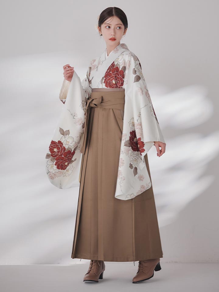 柔らかなベージュ地に、赤と白の椿が気品高く咲く上質な袴。