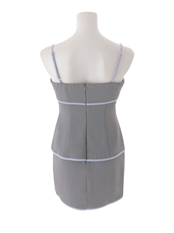 配色のパイピングがボディラインを美しく縁取り、視覚的な着痩せ効果を発揮します。