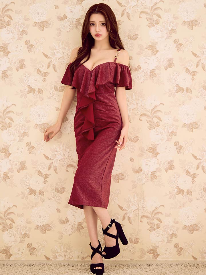 フリルオフショルダーミディアムドレス/キャバドレス【XS-Mサイズ/2カラー】[OF03B] 【IM】 [J-971IM-251220-1]