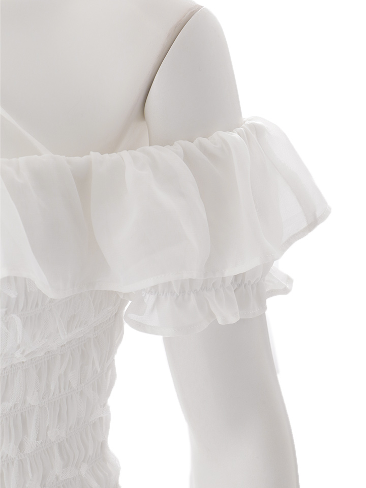 デコルテを美しく彩るオフショルダーが、女性らしい華奢なラインを強調。