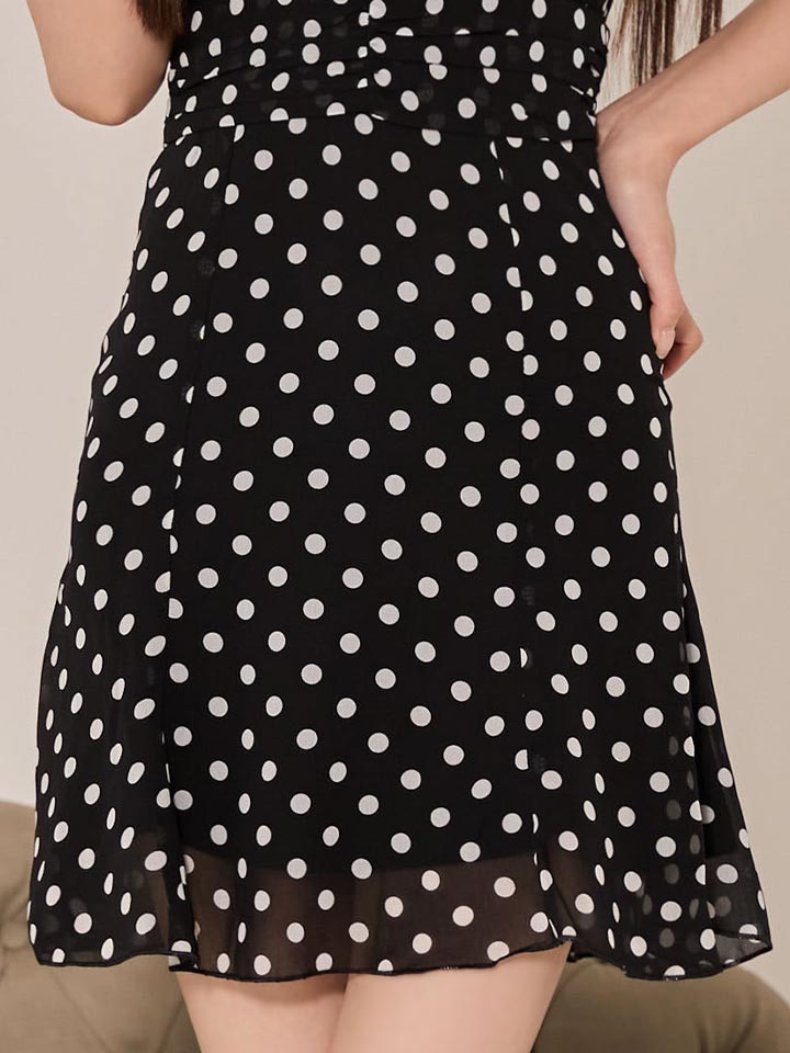 シンプルなシルエット×水玉模様が女の子らしい可愛さを引き出すワンピースドレス。