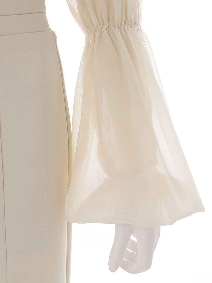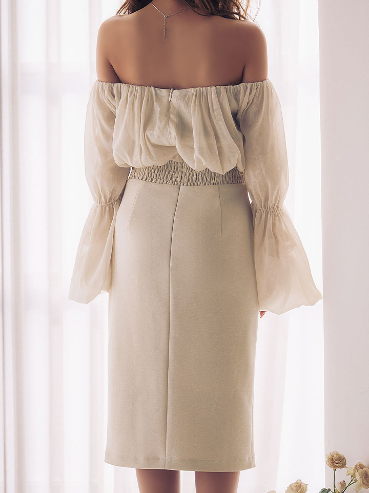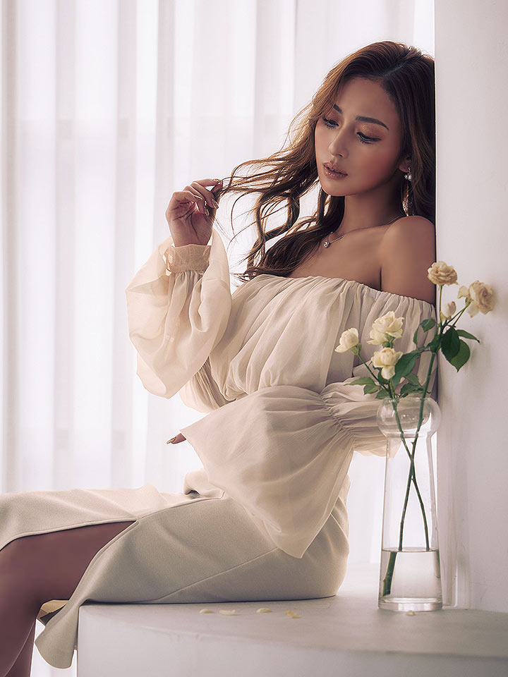 ミディアム丈に長袖を合わせた、上品さと大人の色気が両立するデザイン。