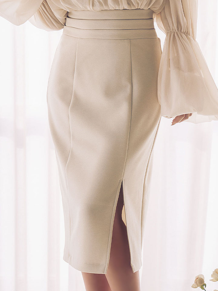 タイトスカートに入ったスリットが脚をきれいに見せ、動きやすさもプラス。