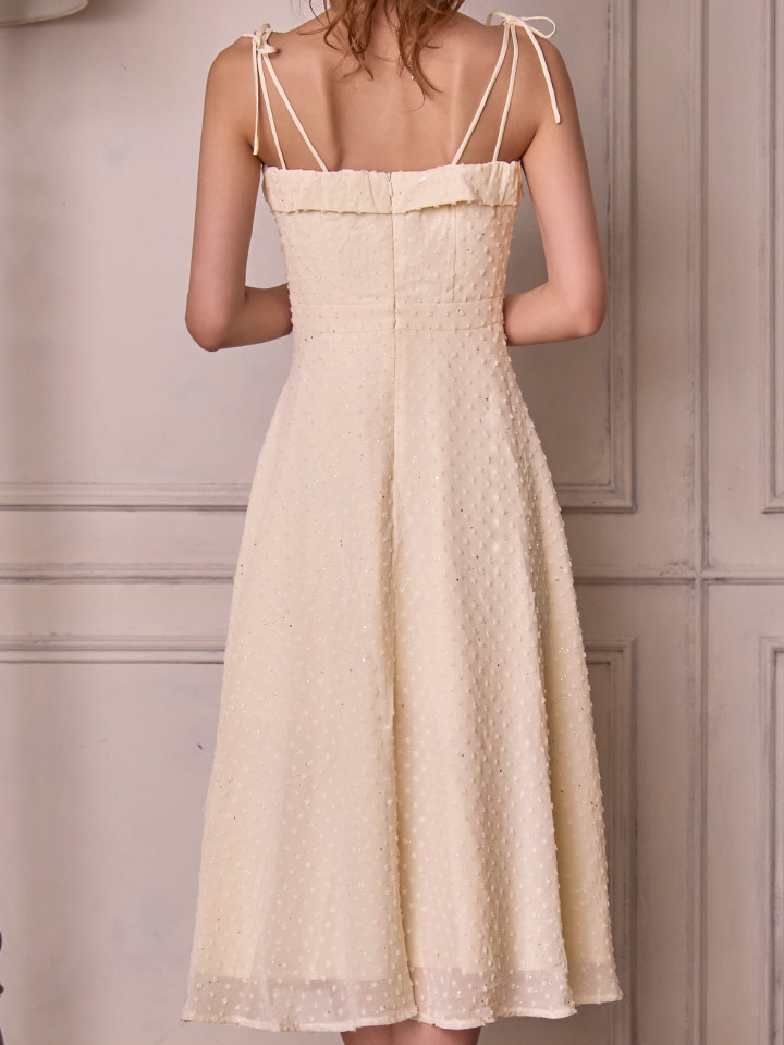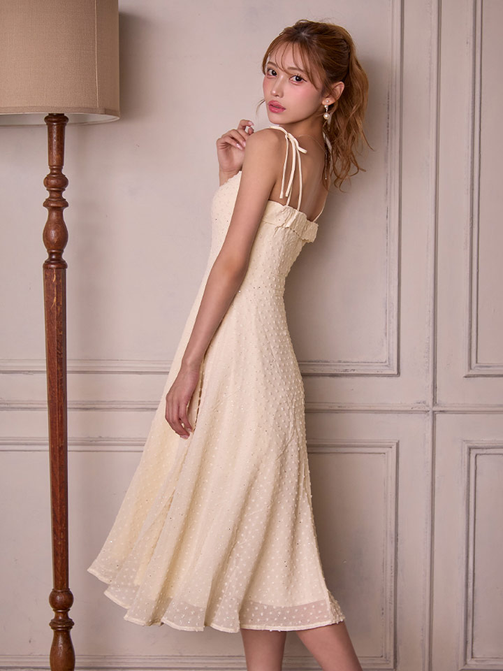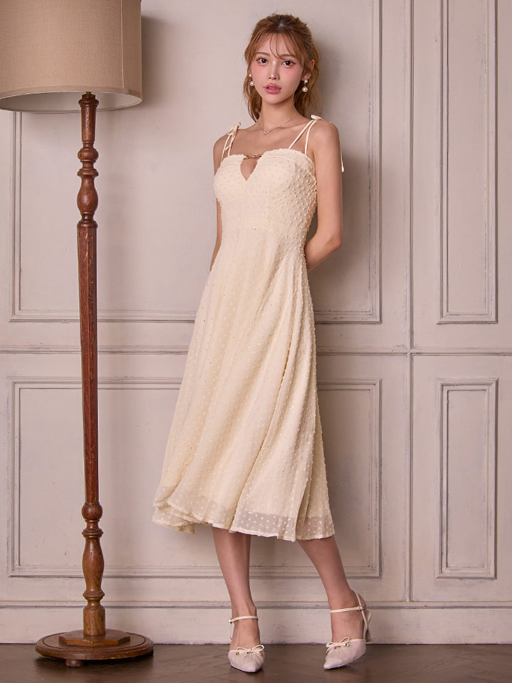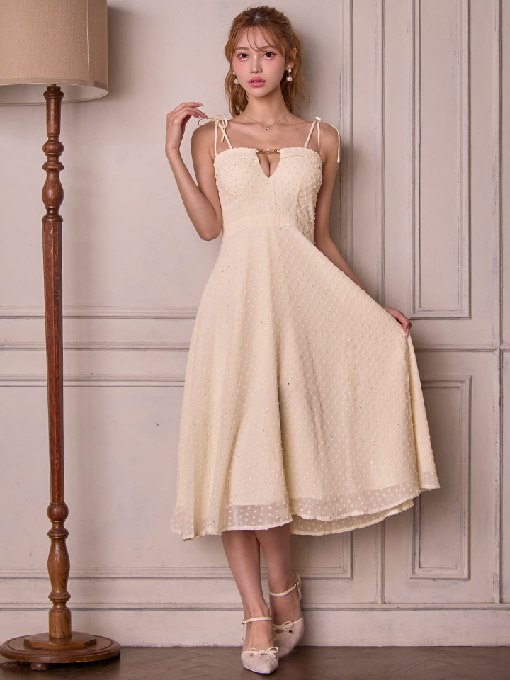 キラキラしたデザイン性あるシフォン生地が織りなすオシャレな雰囲気が魅力的なワンピースドレス。
