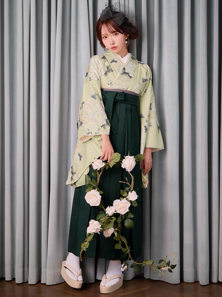 【予約商品/1月中旬発送】牡丹×菊 くすみグリーン二尺袖着物【卒業袴3点セット 二尺袖着物/帯/袴】