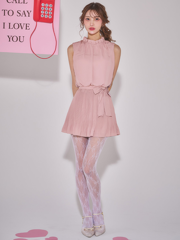 プリーツスカートが女性らしいシルエットを演出し、ウエストのリボンで可愛さをしっかりキープ。