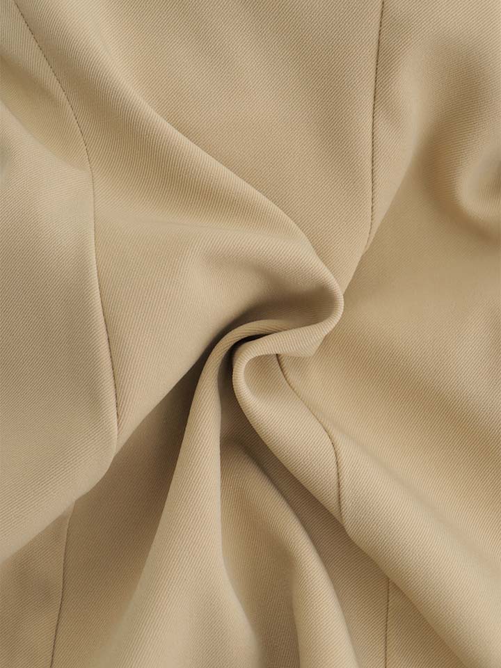 パイピングが全体を引き締め、胸元のゴールドボタンがさりげない華やかさをプラスします。