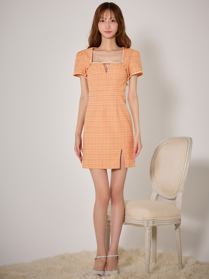 ツイード生地とスクエアネックが上品なデザイン。
