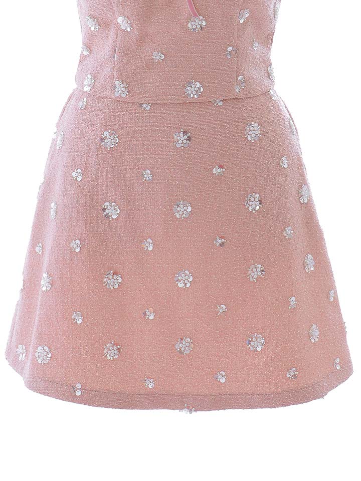 薄ピンクカラーにときめくラメ生地ツイードがオシャレなワンピドレス。