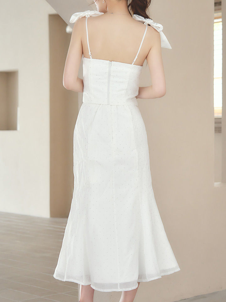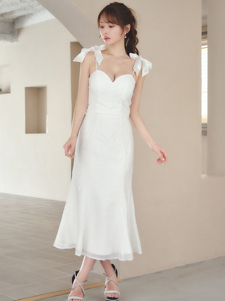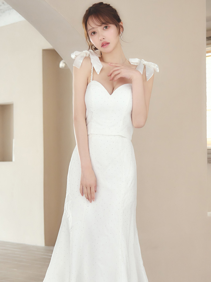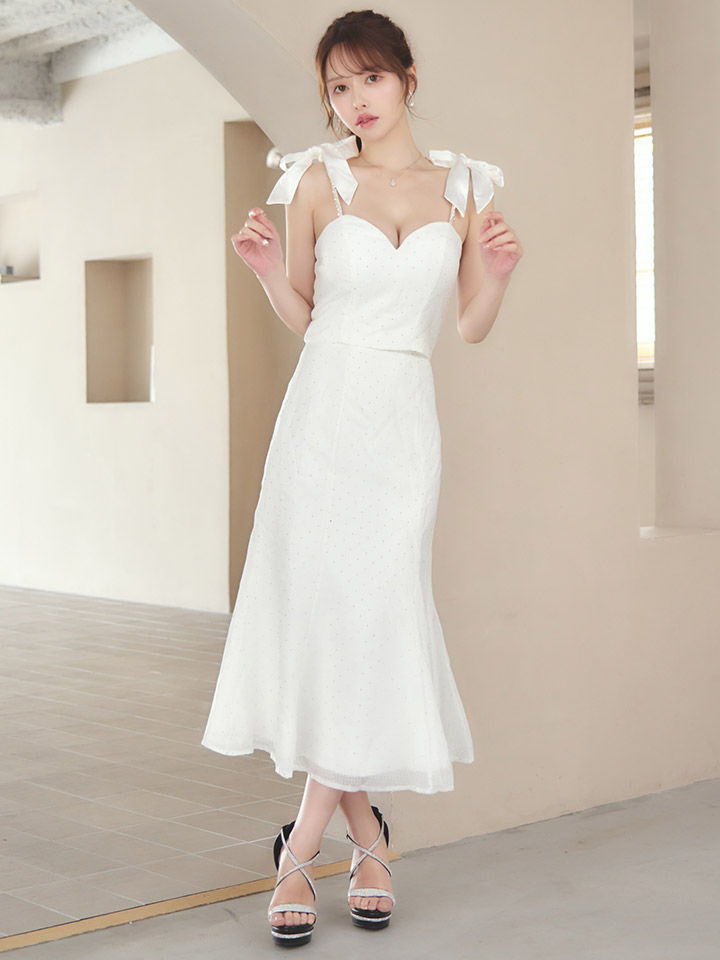 肩紐はサテンリボンとビジューでで肩回りを可憐に綺麗に魅せる