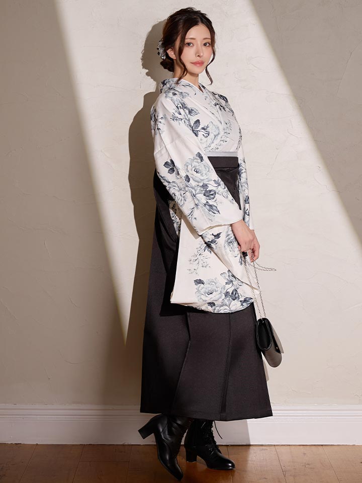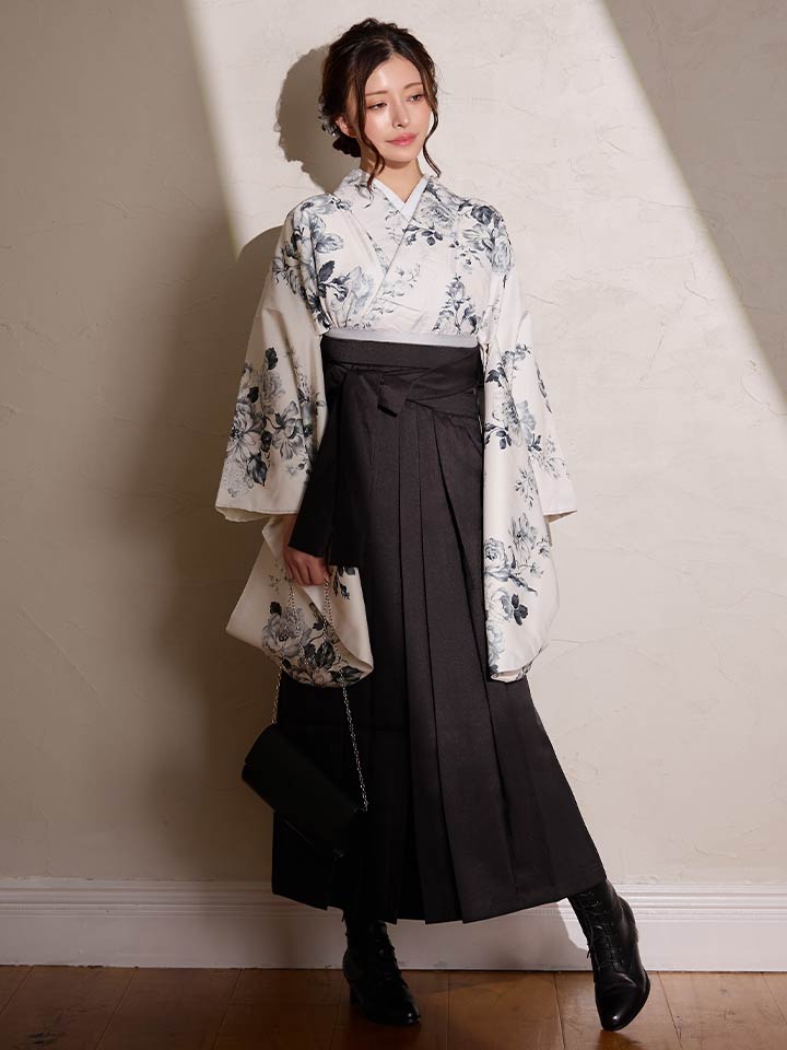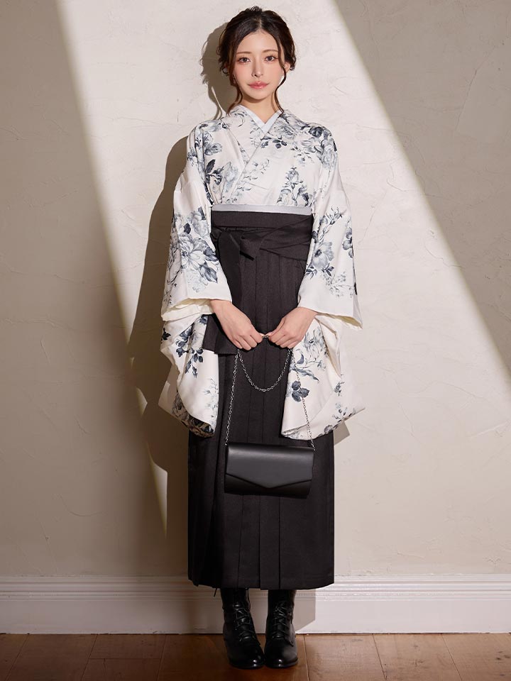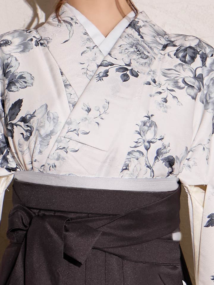 【予約商品 / 1月中旬発送予定】グレーフラワーブーケ ホワイト二尺袖着物【卒業袴3点セット 二尺袖着物/帯/袴】