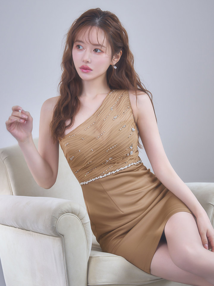 ワンショルダーのデザインが視線を引きつけるミニドレス。