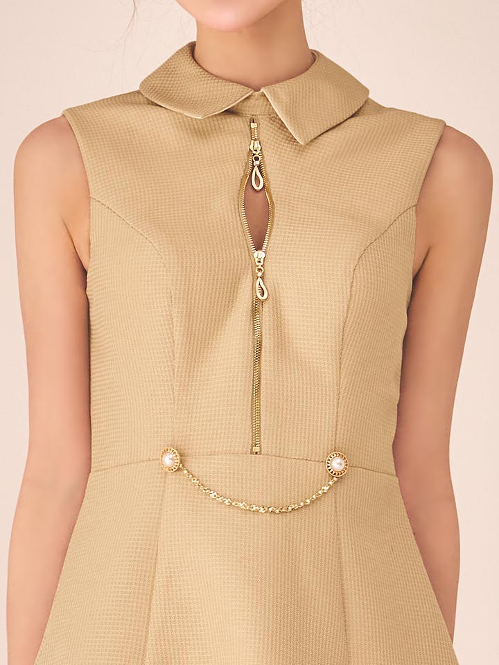 ウエストにはパールボタンとチェーンをあしらい、上品な華やかさをプラス+