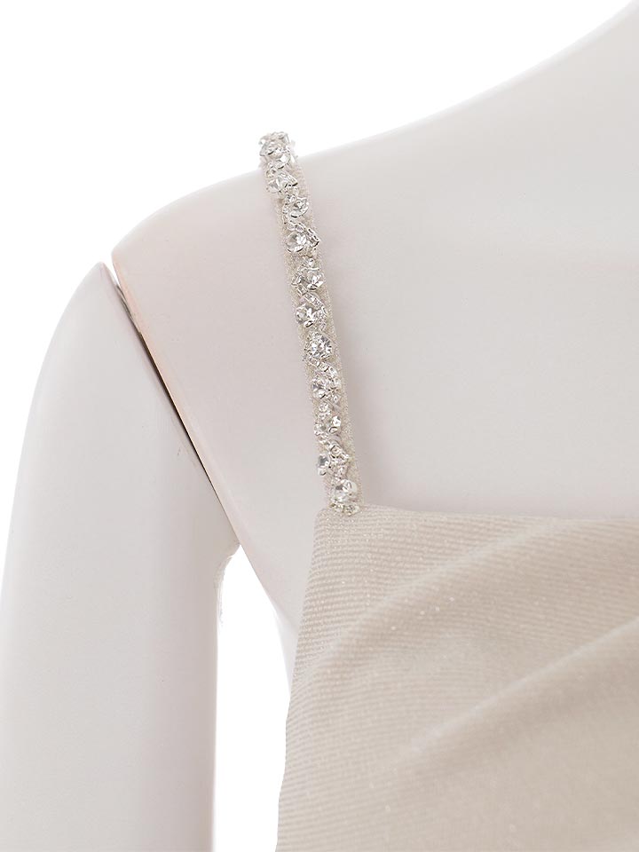 装飾を抑えたシンプルなデザインながら、ギャザーとスリットが圧倒的な存在感を放ちます。