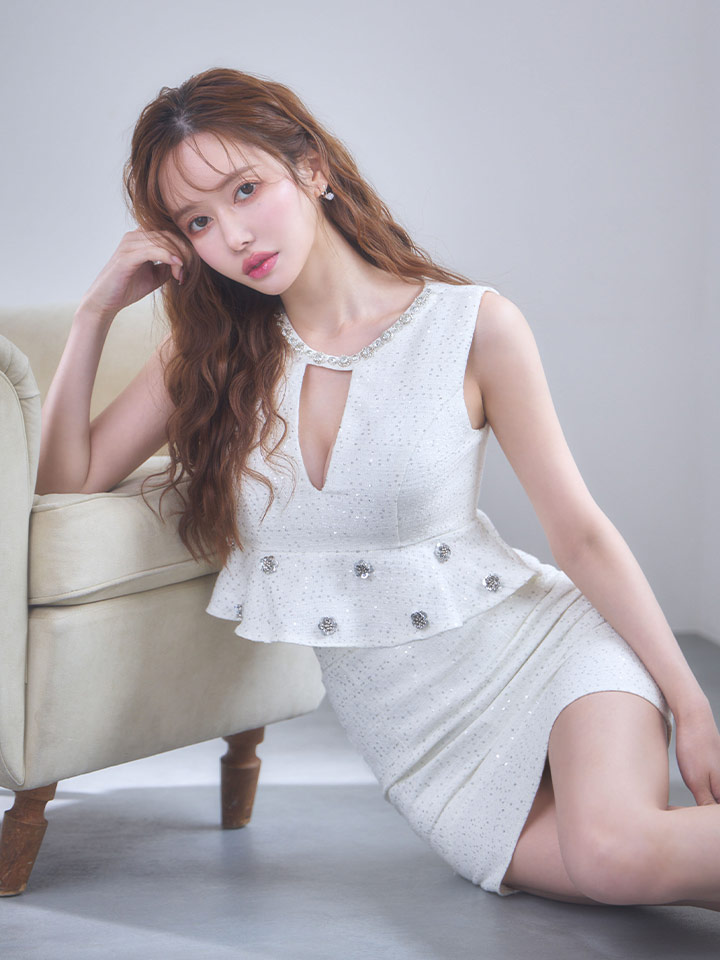 胸元のビジューとトップス裾のお花スパンコールが可愛らしさを引き立て、 タイトなシルエットで甘すぎず大人っぽく着こなせる一着。