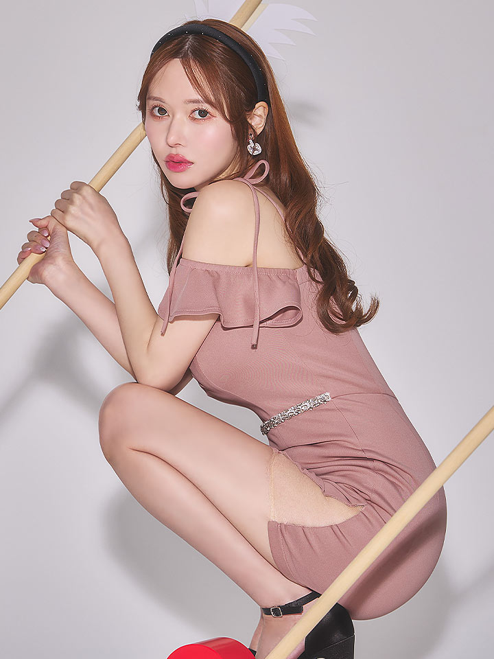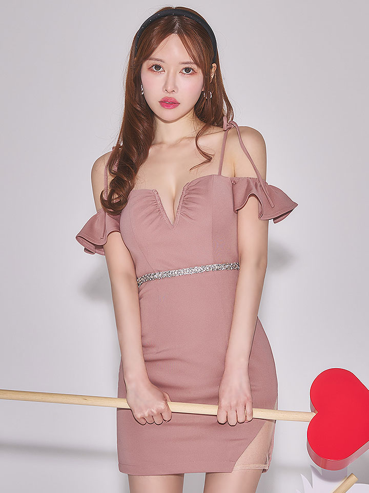 肩紐リボンオフショルウエストビジューミニドレス/キャバドレス【XS-Lサイズ/1カラー】[OF01] 【SB】dzw