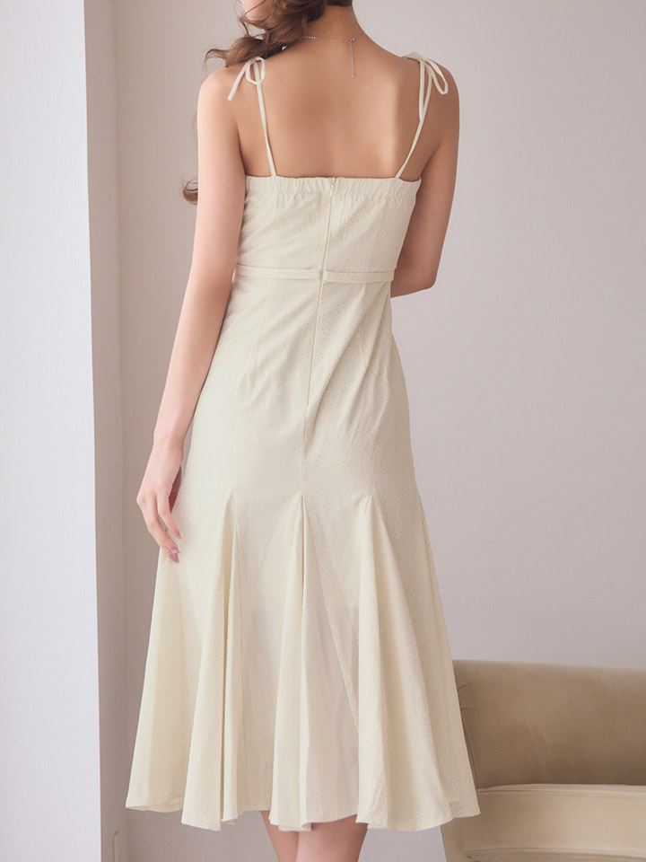 軽やかに広がるフレアスカートときらめく生地で、エレガントな印象を与えるワンピース。