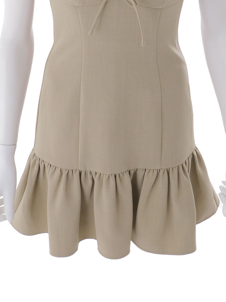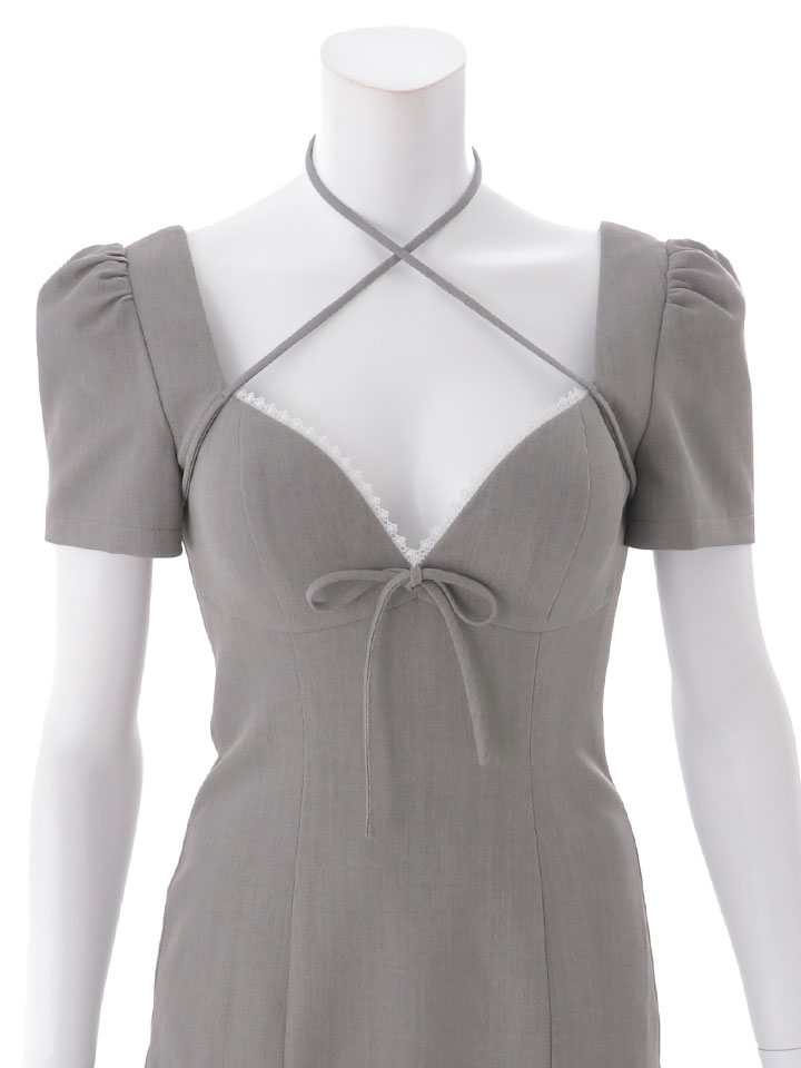 胸元のクロスデザインに紐アクセントを添え、谷間をきれいに見せつつ程よい色気をプラス。