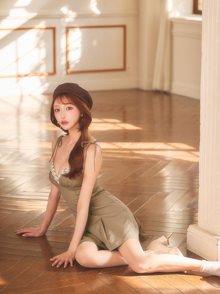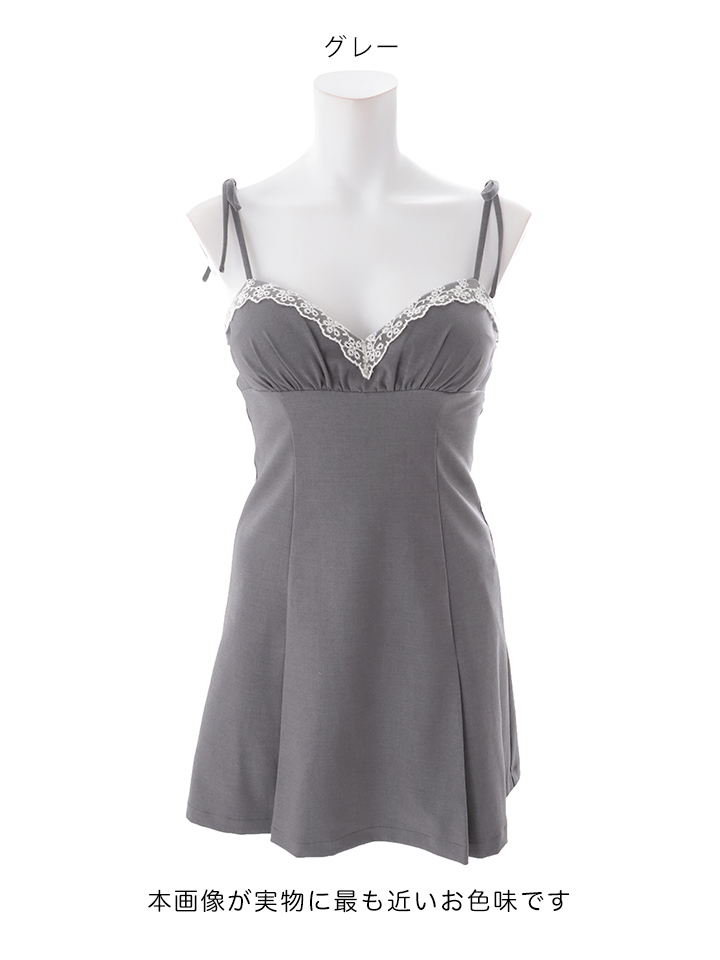胸元にレースをあしらい、上品な甘さをプラスしたミニドレス。