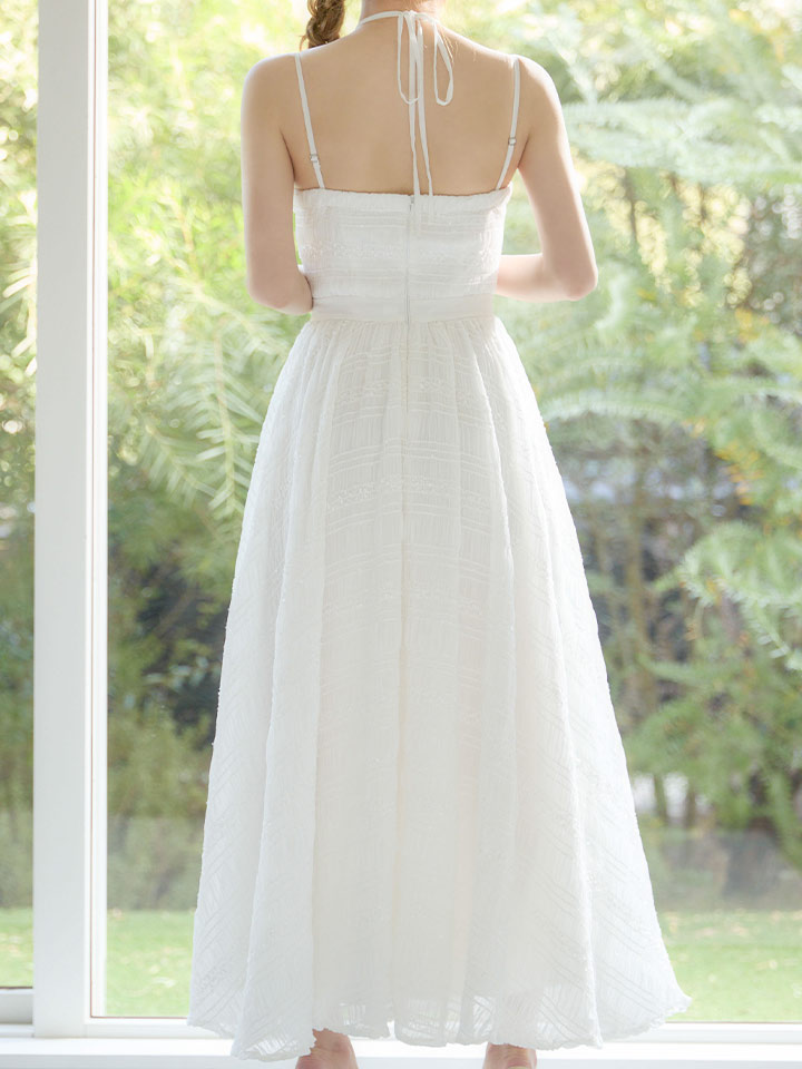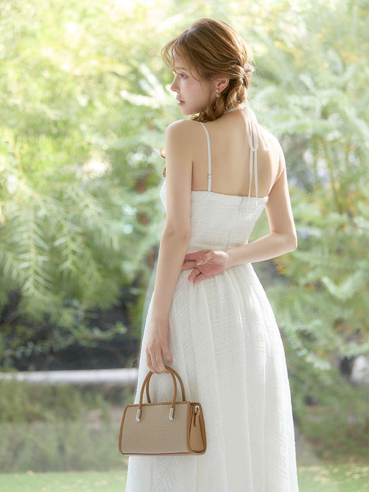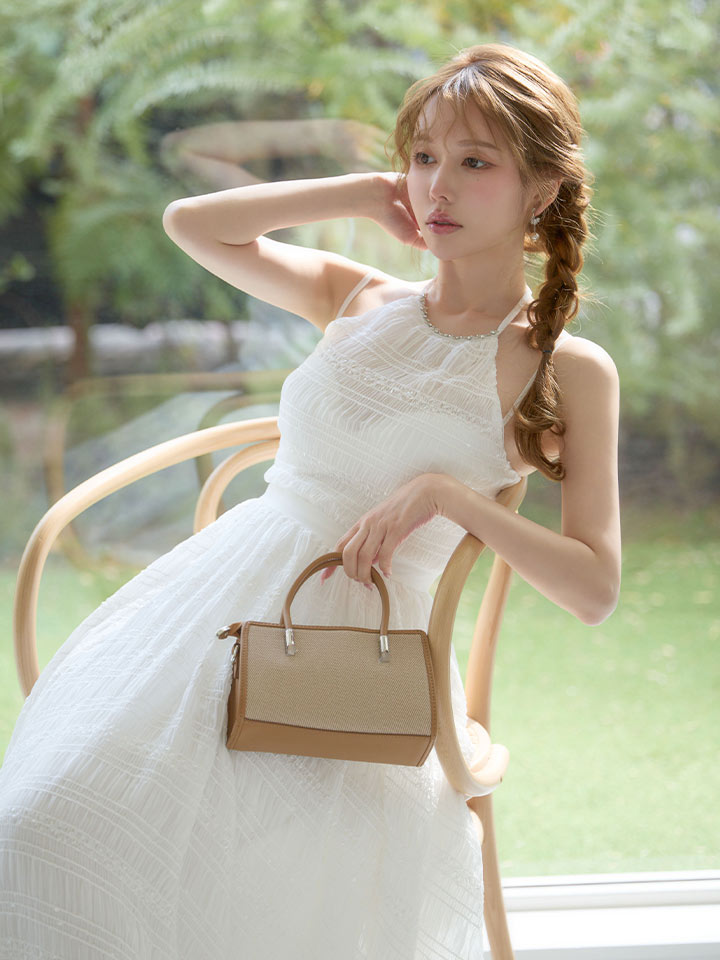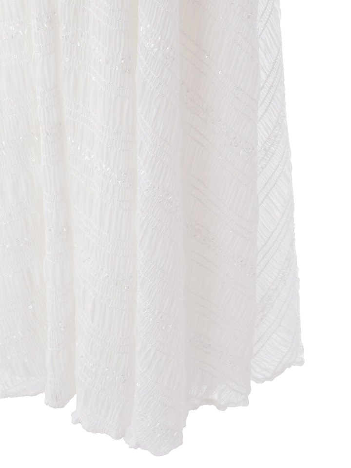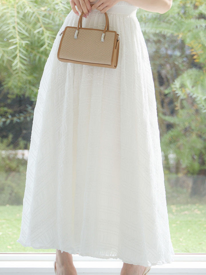 ボリュームのあるフレアスカートと、クシュっとした表情のあるしわ生地が存在感をプラスします。