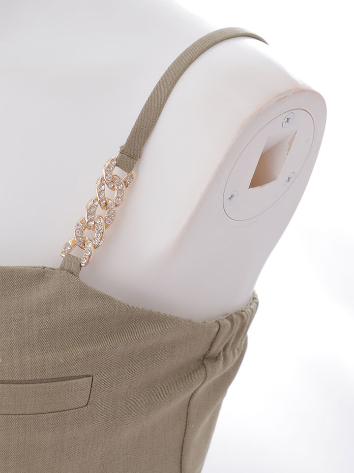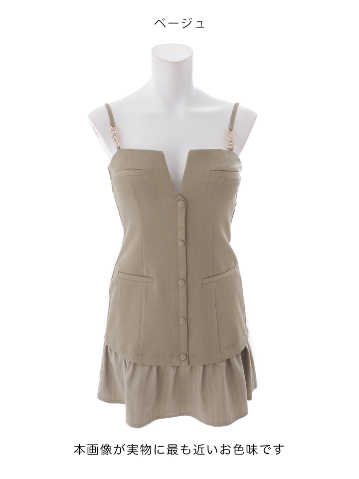 華奢なキャミソールストラップが肩周りをスッキリと見せ、夜の店内でも圧倒的な存在感を放つ一着です。