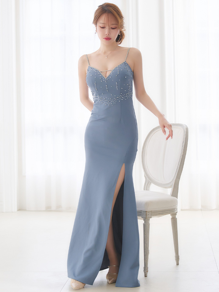 ウエストに入ったビジューラインがくびれを綺麗に強調し、歩くたびに気品と色気が漂う仕上がり。
