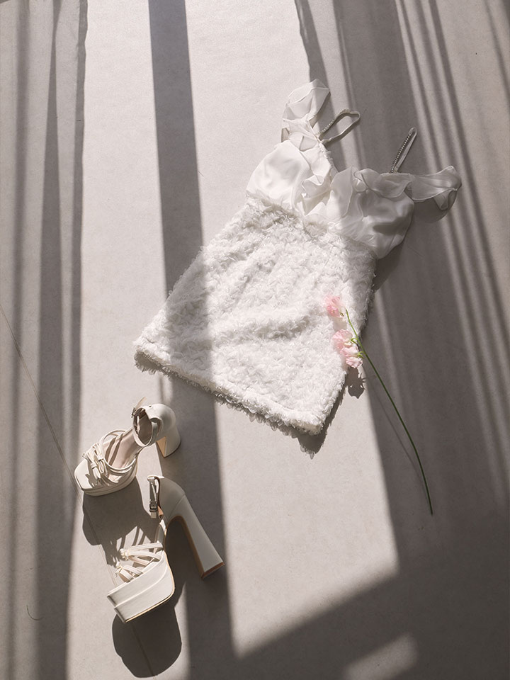 オフショルダーで可愛さを引き立てた甘めデザインのミニドレス。