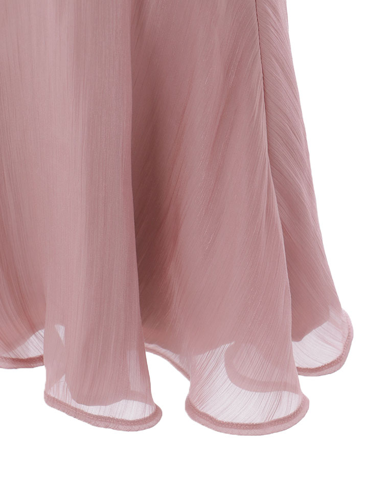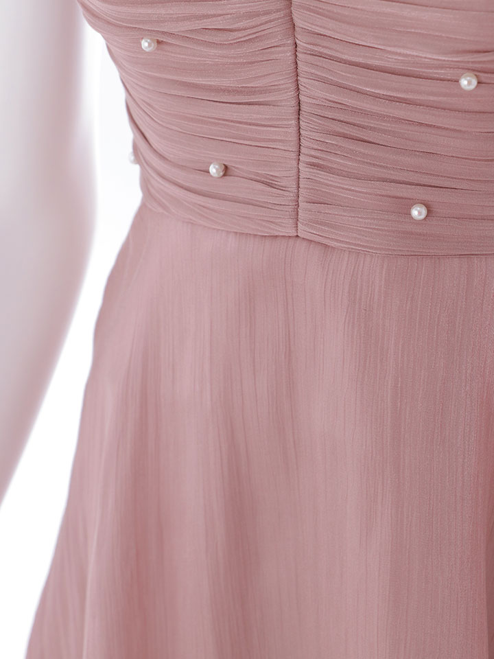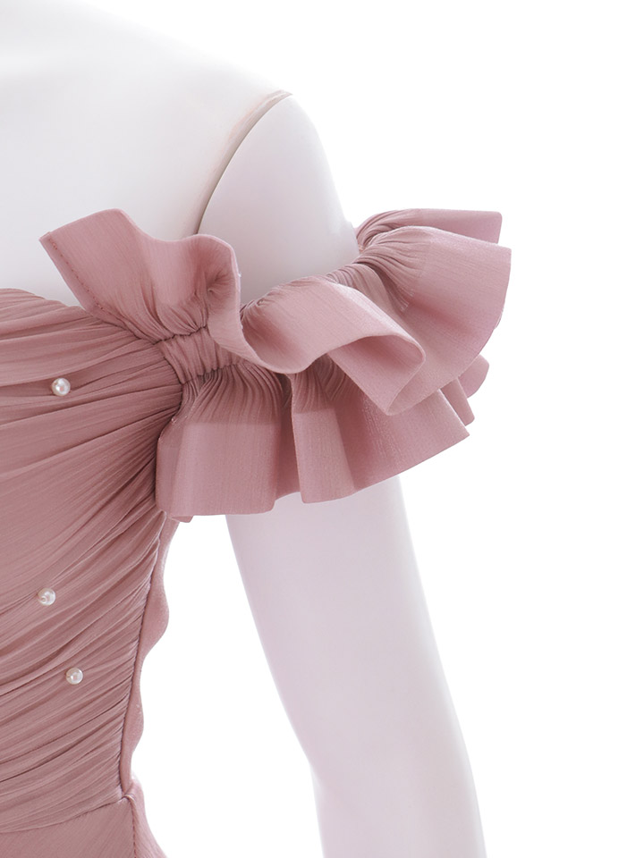 デコルテを美しく見せる谷間見せデザインで、甘さの中にさりげない色気もプラス。