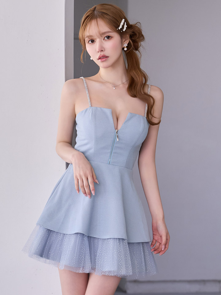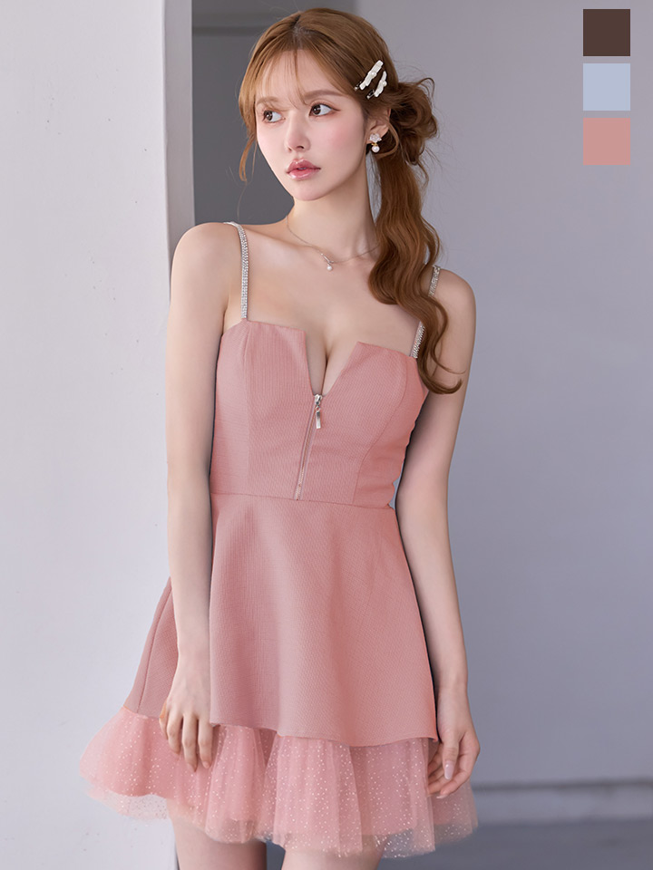 胸元のファスナーで開き具合を調整でき、谷間見せも楽しめるデザインです。