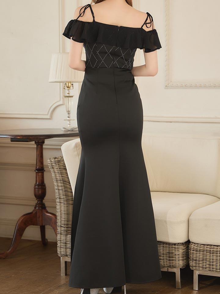 フリルをあしらったオフショルデザインが目を引くロングドレス。