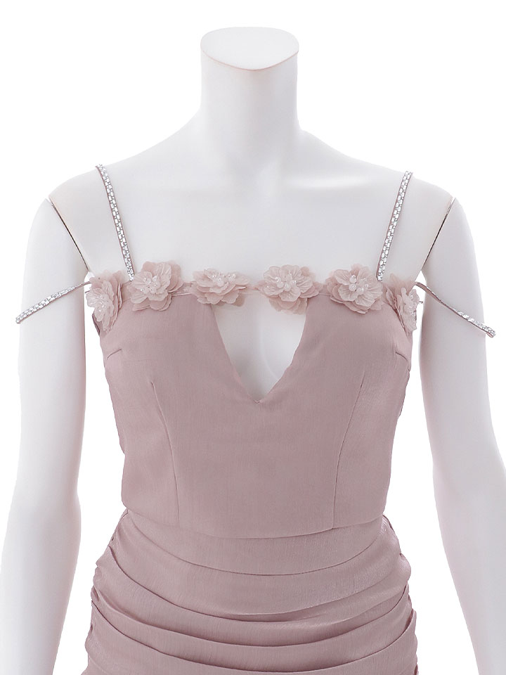 胸元のお花の装飾が華やかさを添え、二の腕のチェーンが煌びやかでかわいらしいアクセントに。