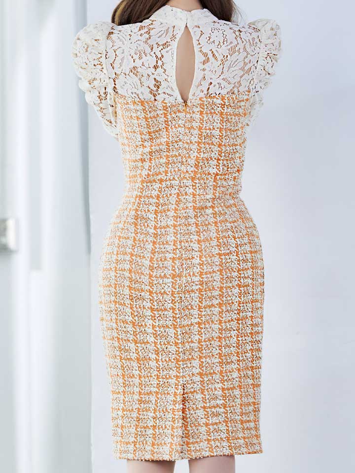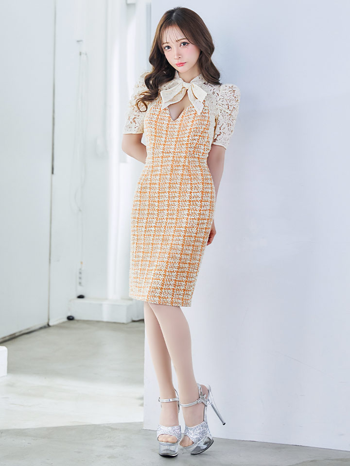 レースボウタイリボンチェックツイードミディアムドレス/キャバドレス【S-Lサイズ/3カラー】
