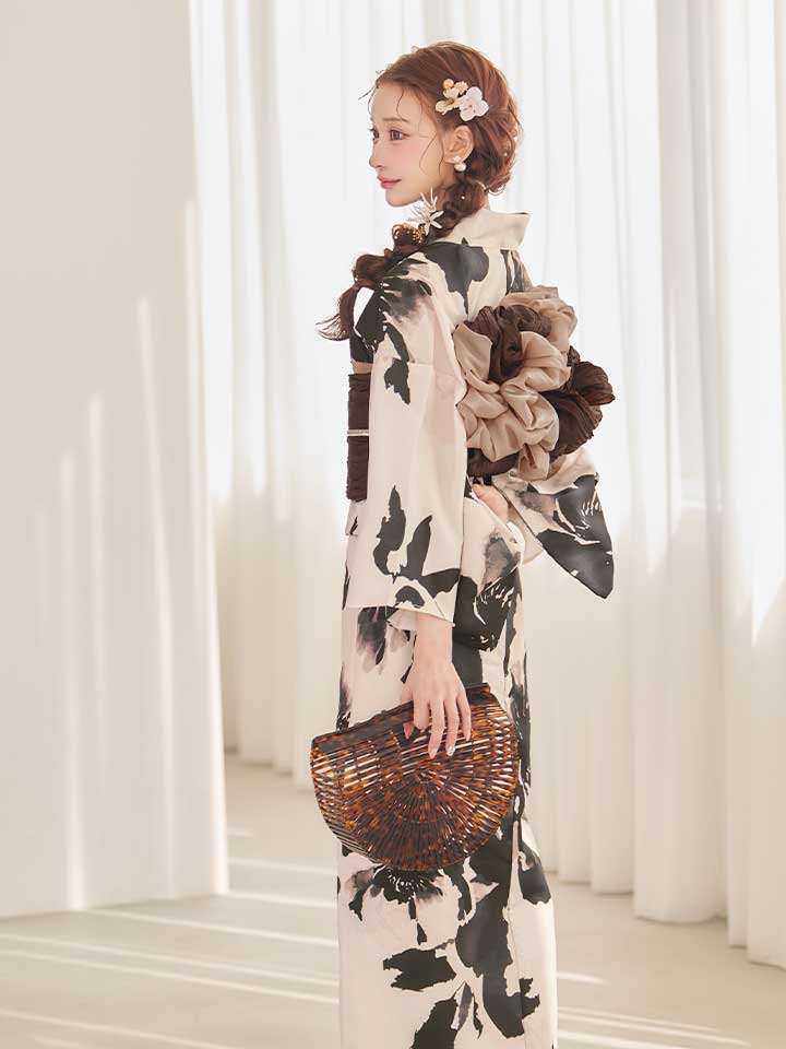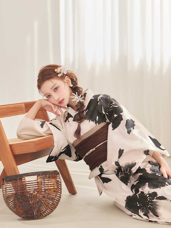 墨色の花が美しく咲き誇る、和の趣あふれるモノトーン浴衣。