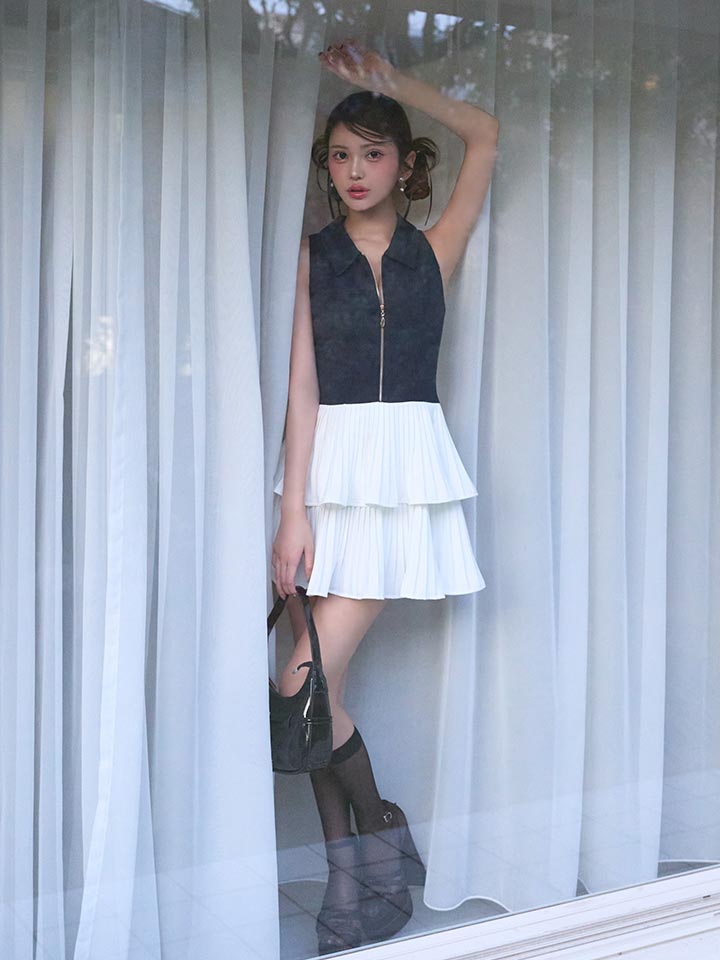 ミニ丈の2段ティアードスカートが脚をきれいに見せ、動くたびに軽やかな印象を与えます。