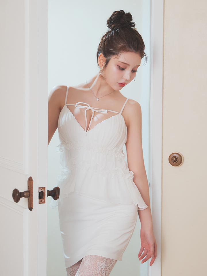 シフォン/ギャザー/リボン/キャミソール/ペプラム/谷間見せ/背中見せ/タイト/ミニドレス/キャバドレス【XS-Mサイズ/2カラー】[OF03] 【YN】NdzwuBF