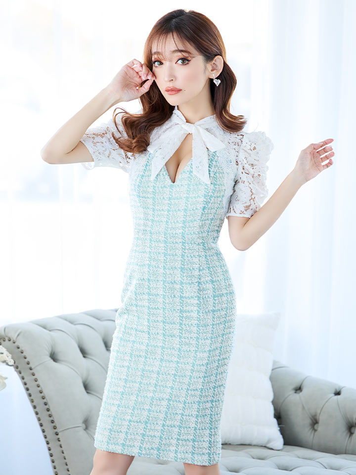 レースボウタイリボンチェックツイードミディアムドレス/キャバドレス【S-Lサイズ/3カラー】