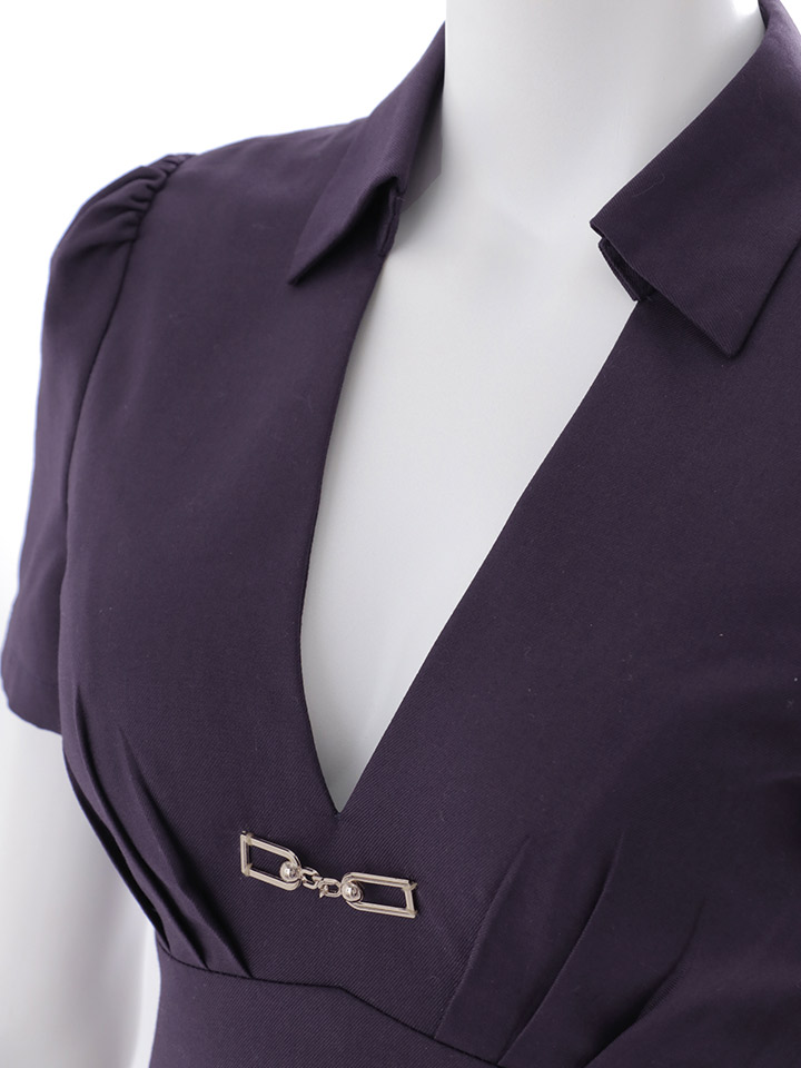 胸元のゴールド金具と谷間見せでさりげない色気を演出し、襟デザインが上品さをプラス。