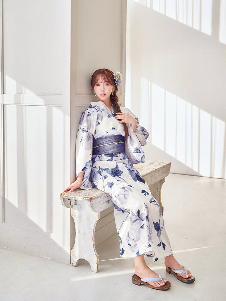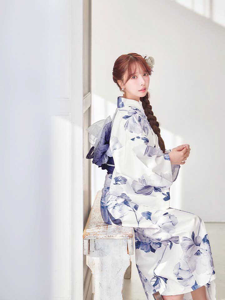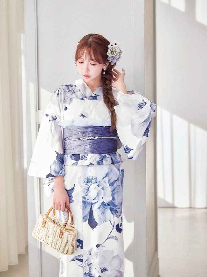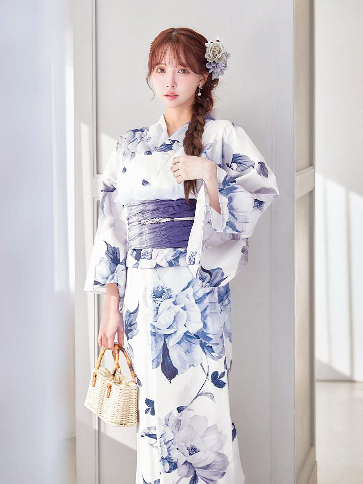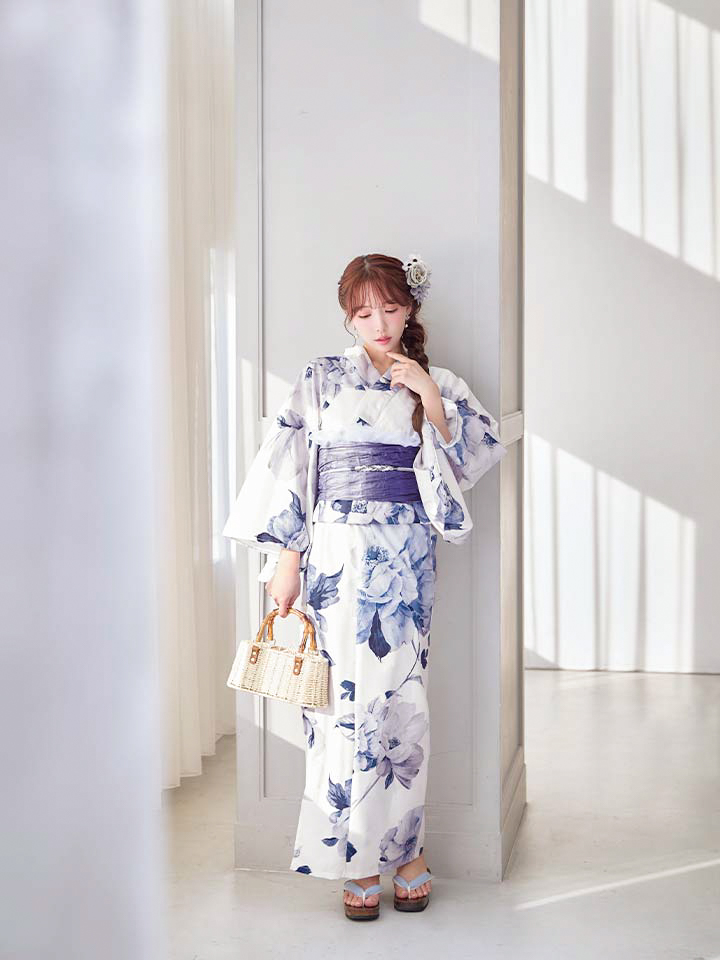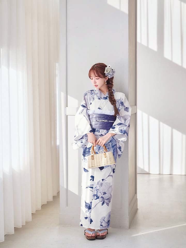 清らかな白地に、凛と咲く蒼色の牡丹を描いた気品あふれる浴衣。