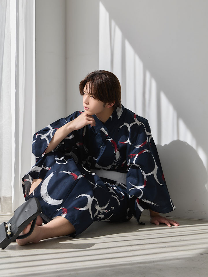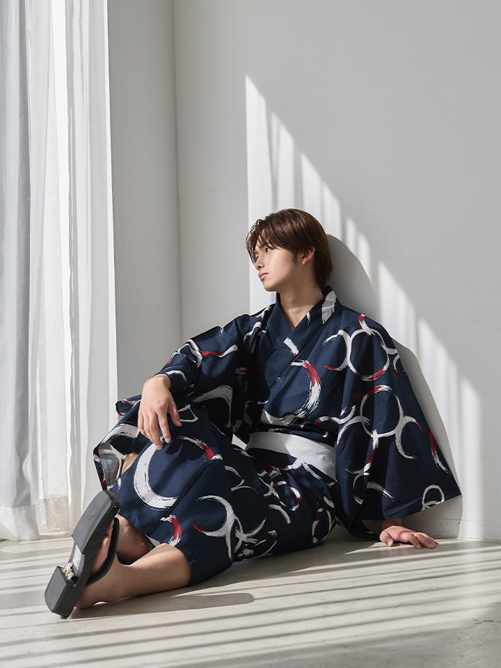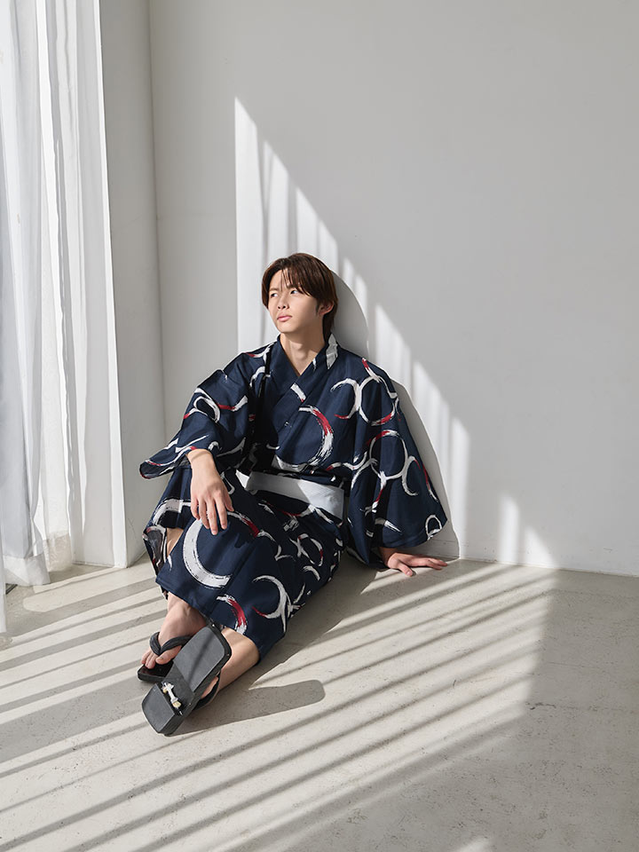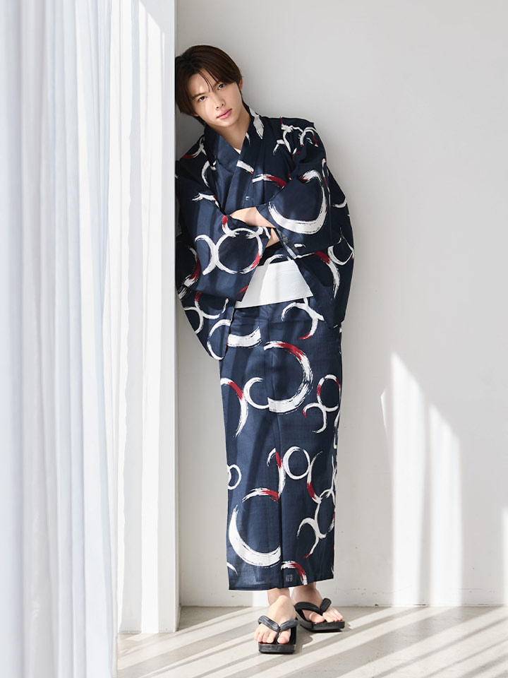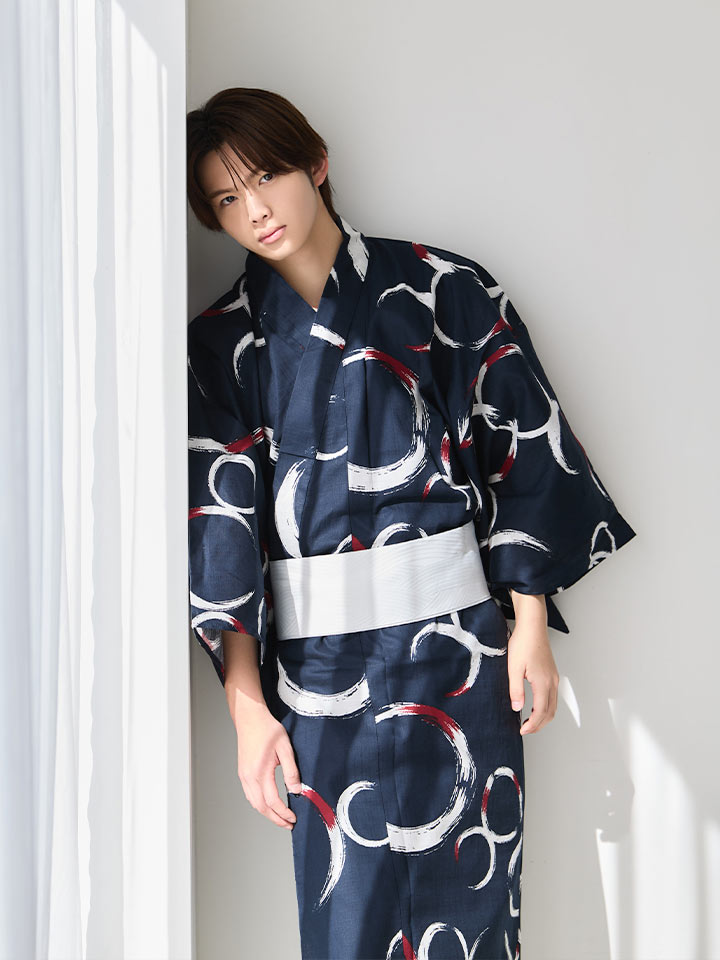 ネイビーをベースに白と差し色の赤で描かれた円模様が印象的な、モダンなメンズ浴衣。