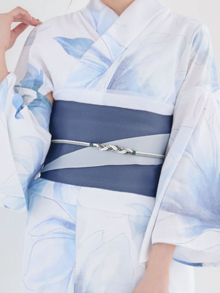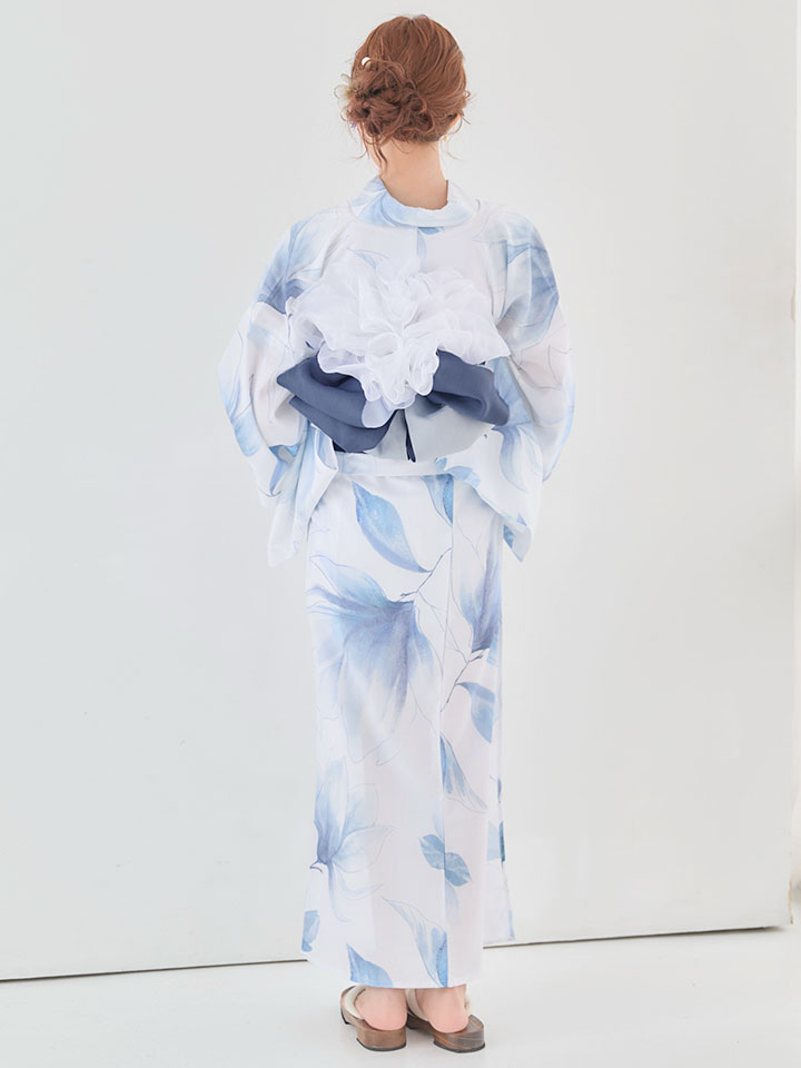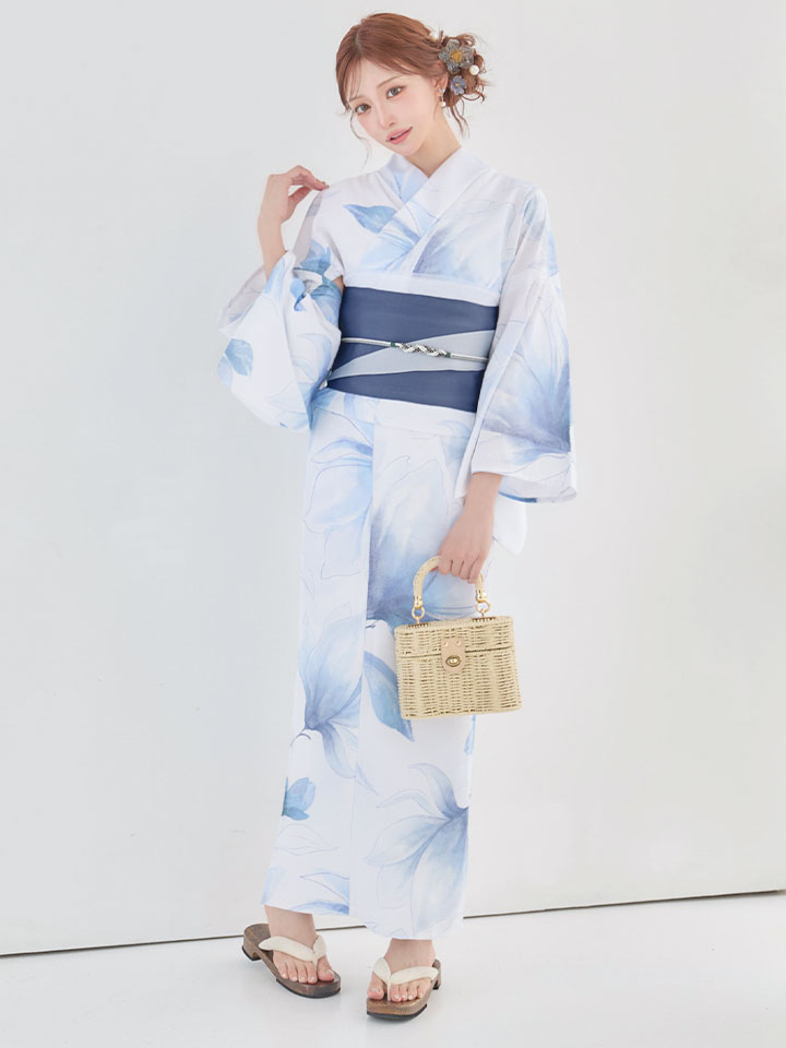 清涼感あふれる蒼花が白地に映える、凛とした美しさの浴衣。