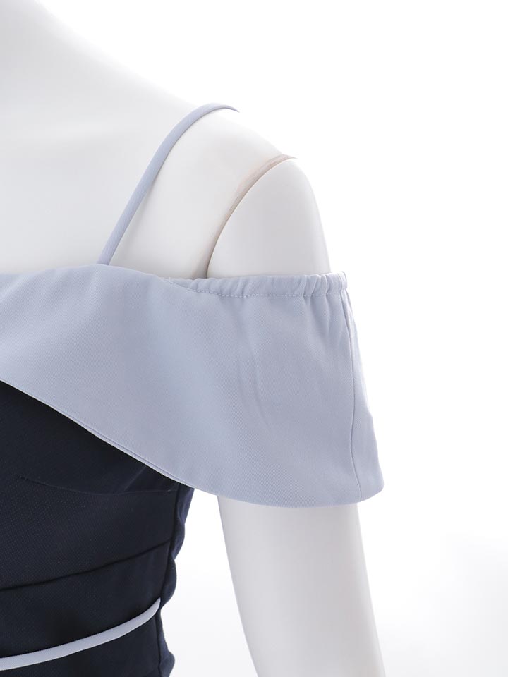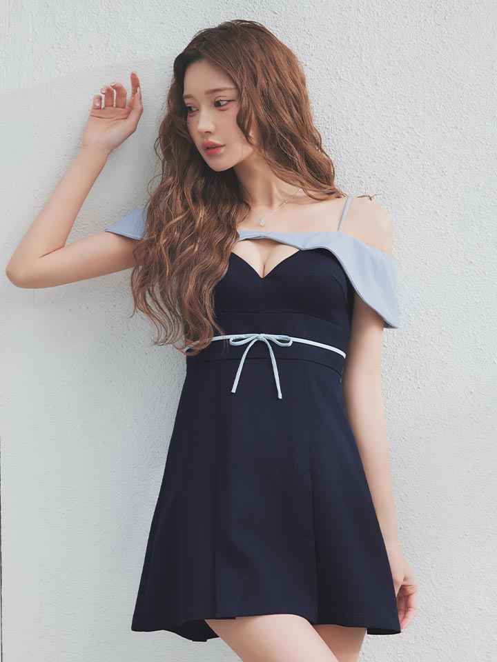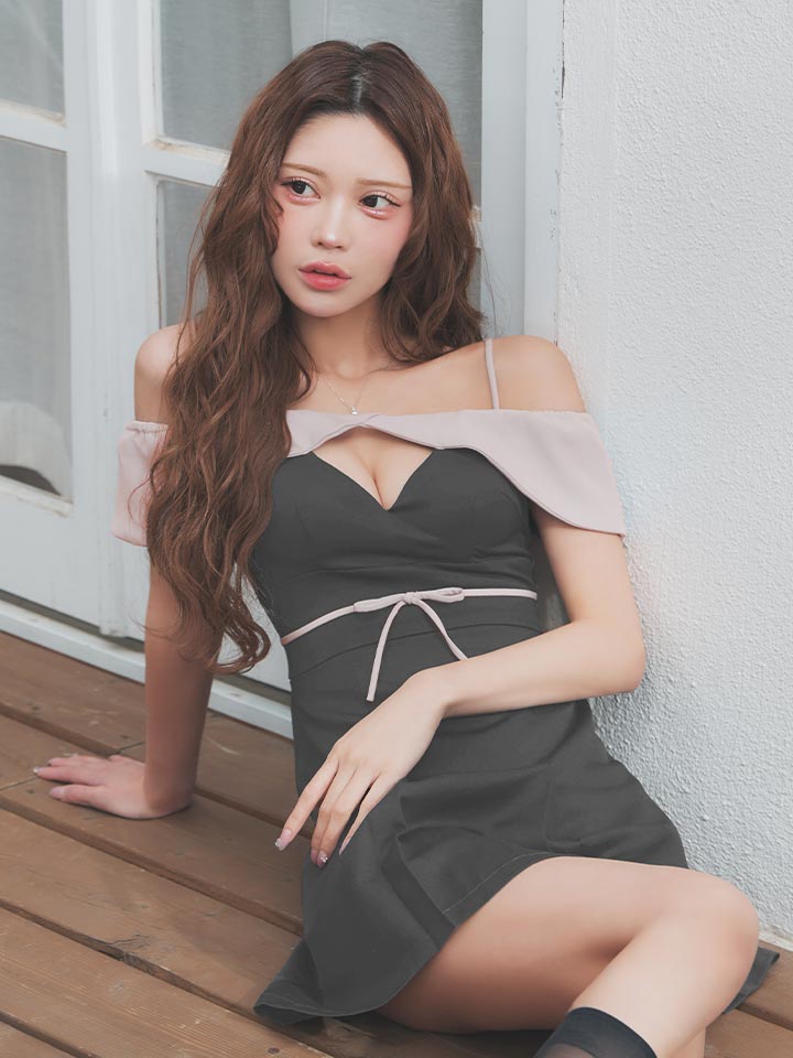 女性らしいデコルテを引き立てるオフショルダーデザインのミニドレス。