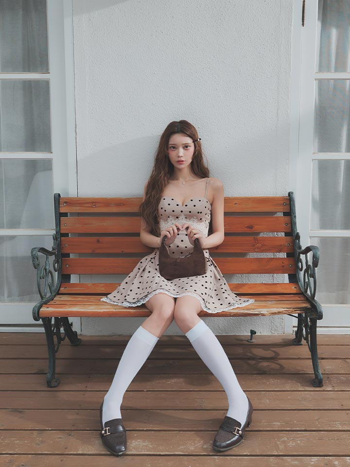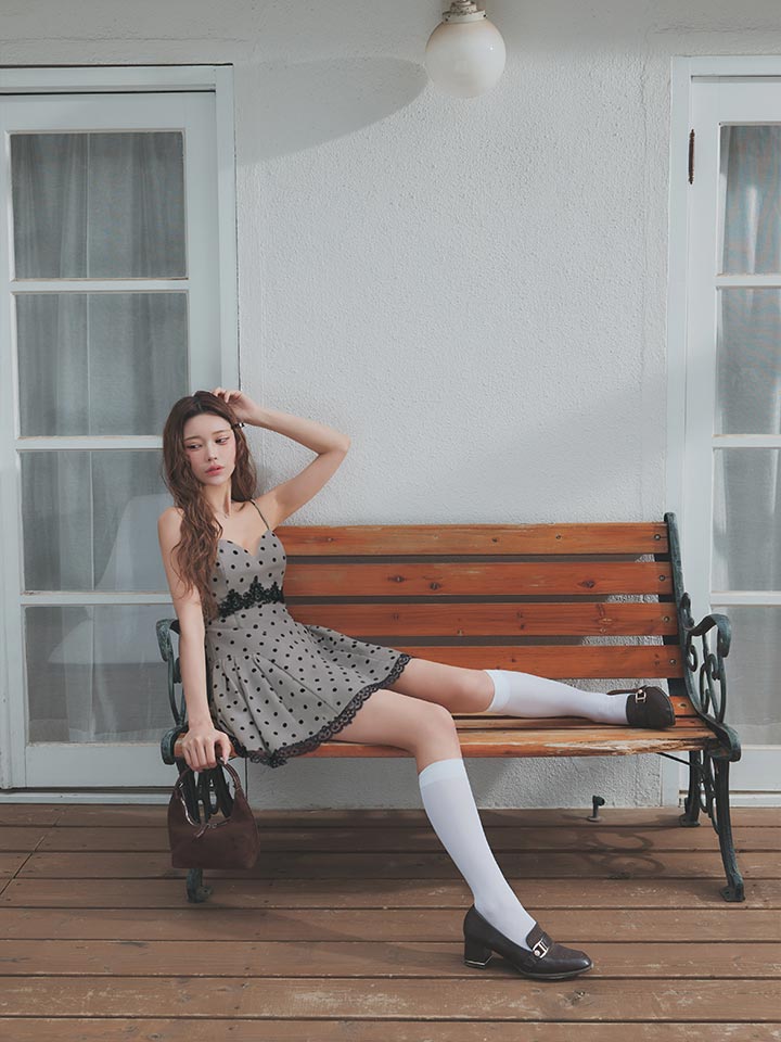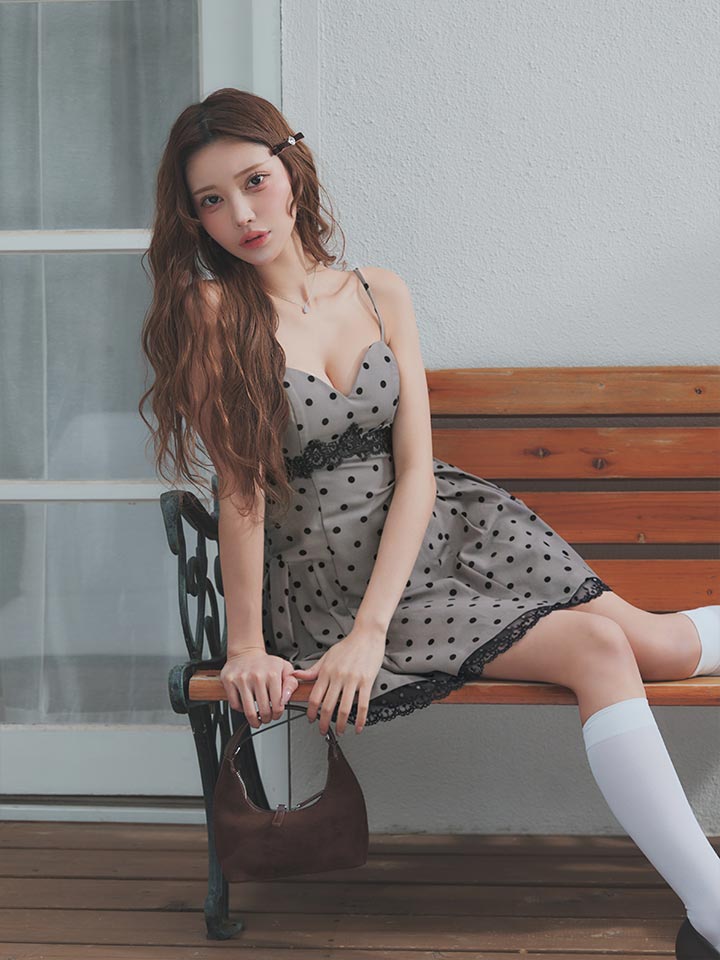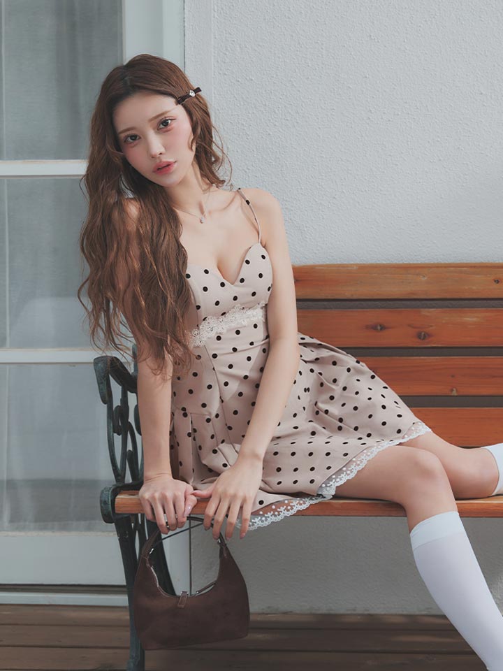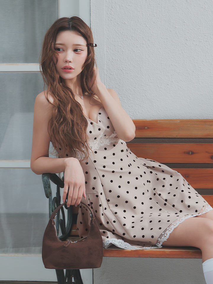 可憐なドット柄が目を惹く、フェミニンな雰囲気のミニドレス。