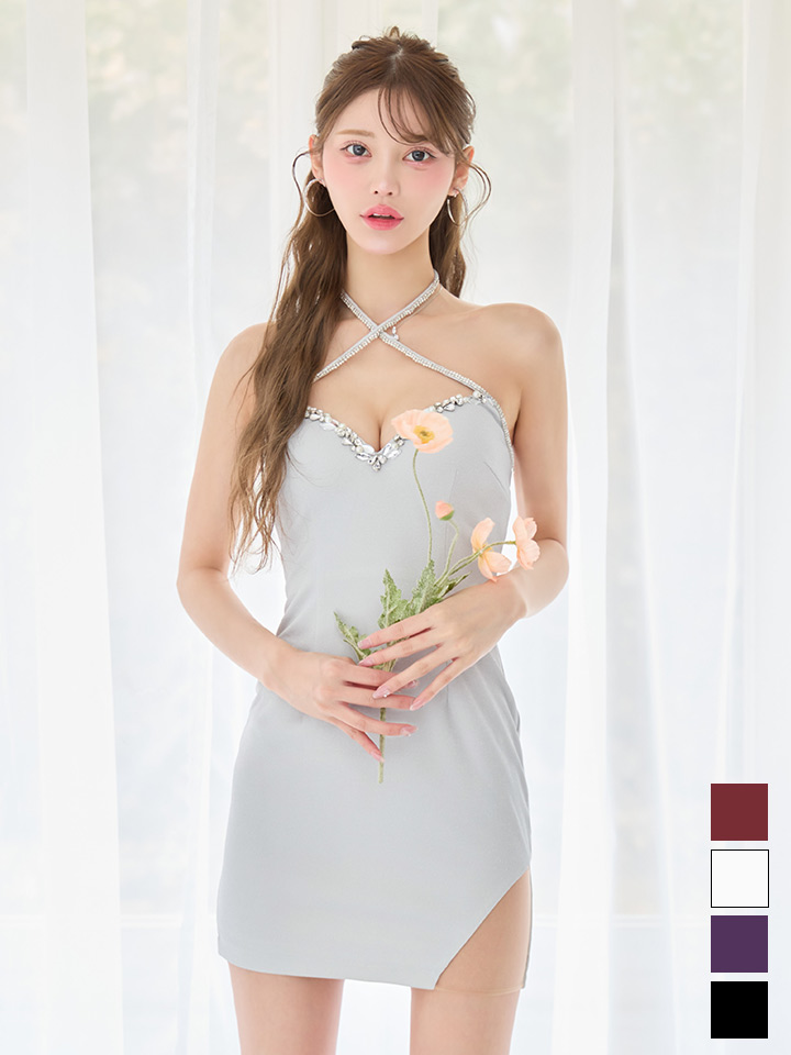 ビジューの輝きが華やかさを添える、色香漂うミニドレス。