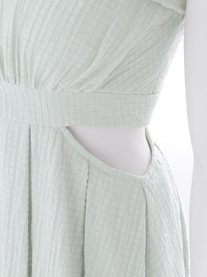 きちんと感のある胸とじデザインに、ウエストのスリットでさりげないセクシーさをプラス。