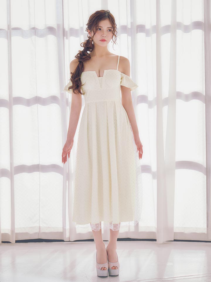 #ホワイト #アイボリー #りな着用 #ミディアム丈ドレス #ワンピースドレス #チュール #チェック柄 #キャミ #谷間見せ(魅せ) #Aライン・フレアスカート #スイート・可愛い(かわいい)系
