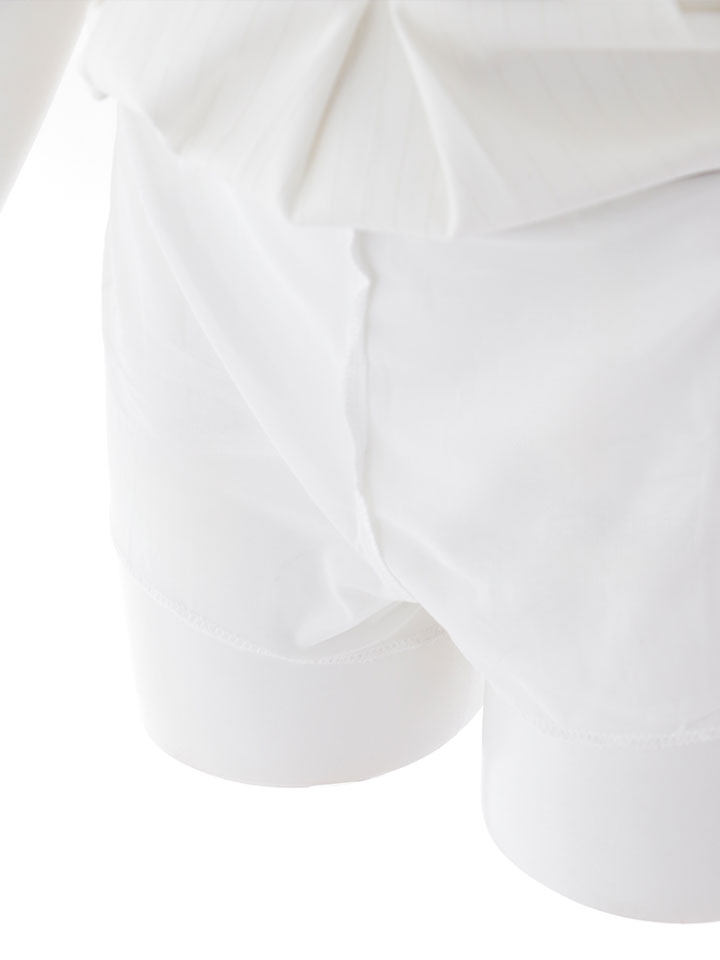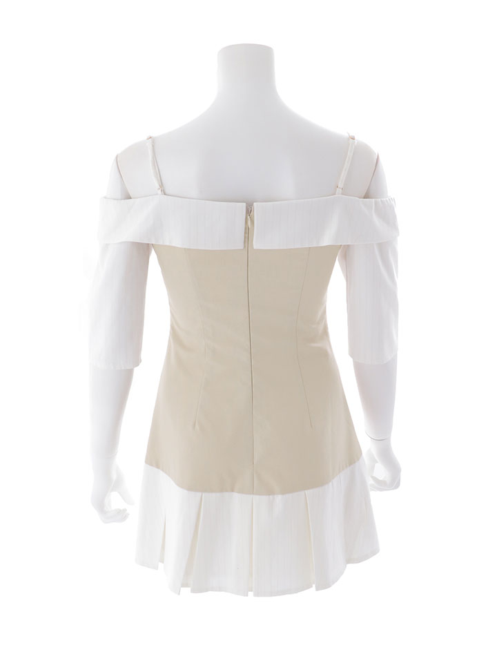 シャツ風デザインできちんと感を出しつつ、オフショルダーで女性らしい抜け感をプラスしたミニドレス。