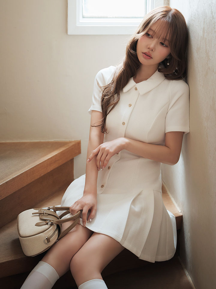 襟付き/半袖/ボタン/ワッフル/プリーツ/ミニドレス/キャバドレス【XS-Mサイズ/1カラー】[OF03]【IM】dzmgIA [J-996IMdzmgIA-260427-1]