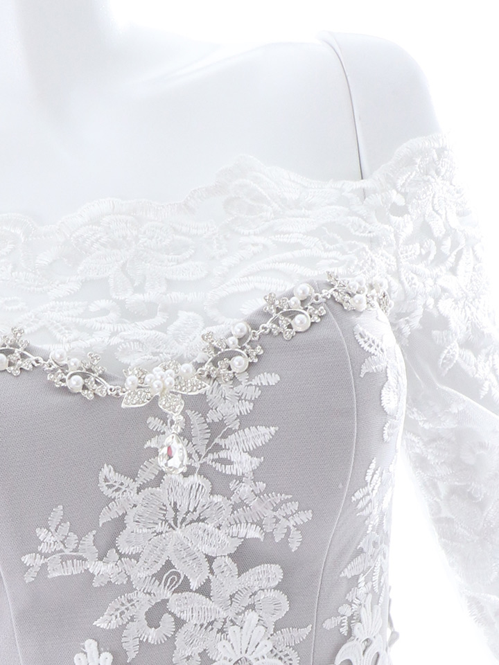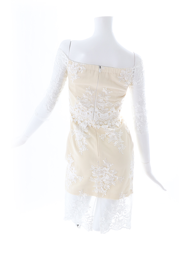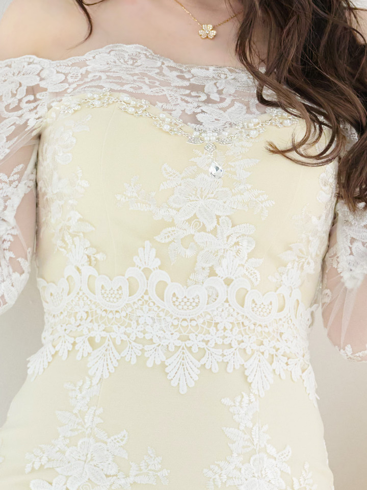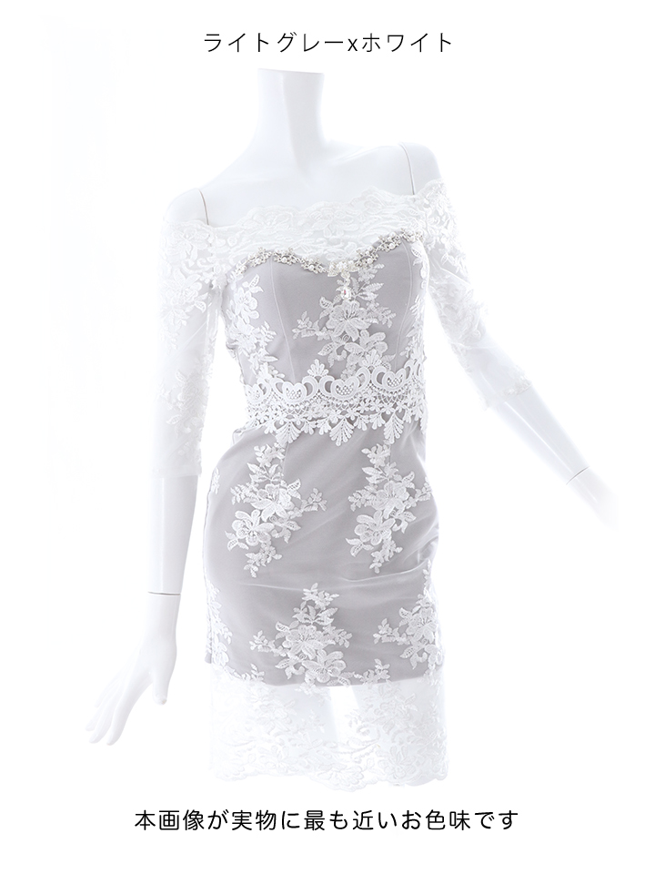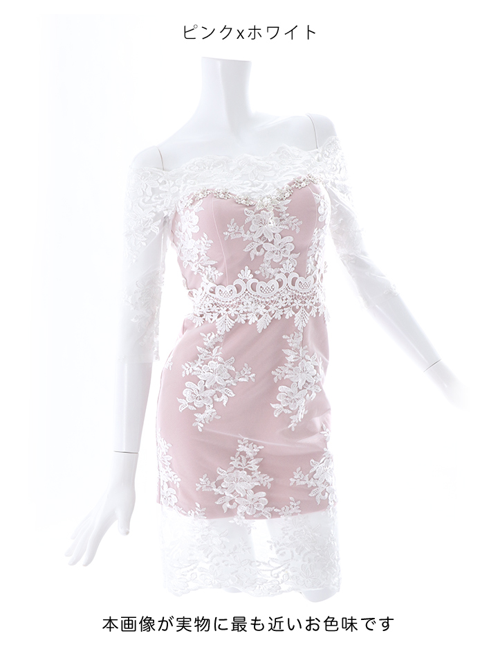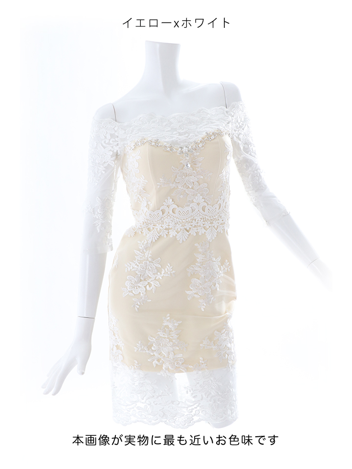 刺繍レース/ビジュー/華やか/袖レース/背中隠し/オフショルダー/透け感/ミニドレス/ キャバドレス【S-Mサイズ/3カラー】[HC02]【 jAOC】 [jAOC3069-1-1]